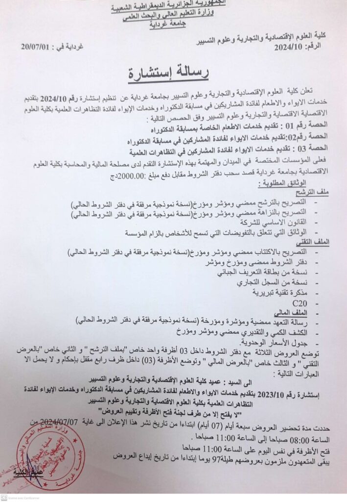 تعلن كلية العلوم الإقتصادية والتجارية وعلوم التسيير بجامعة غرداية عن تنظيم إستشارة رقم 10 / 2024 متعلقة بتقديم خدمات الايواء والاطعام لفائدة المشاريكين في مسابقة الدكتوراه وخدمات الإيواء لفائدة التظاهرات العلمية بكلية العلوم الإقتصادية والتجارية وعلوم التسيير وفق الحصص التالية :