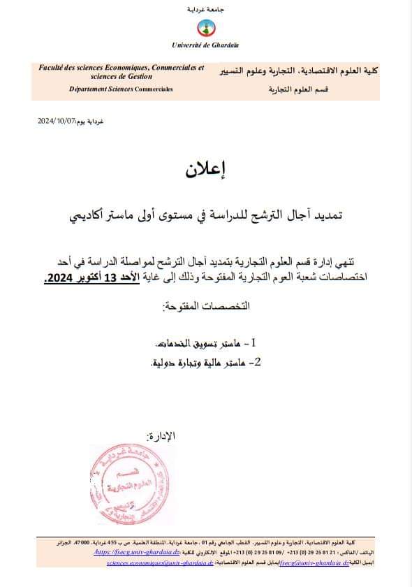 تعلن كلية العلوم الإقتصادية، التجارية وعلوم التسيير عن تمديد آجال الترشح للدراسة في مستوى أولى ماستر أكاديمي