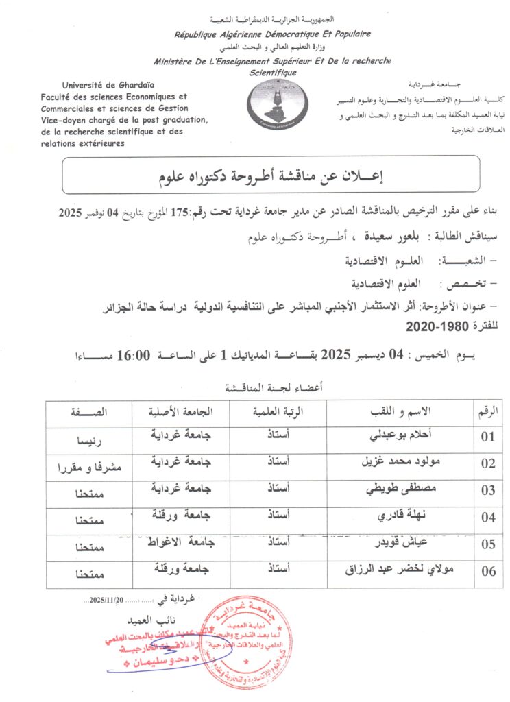 بناء على مقرر الترخيص بالمناقشة الصادر عن مدير جامعة غرداية تحت رقم : 175 المؤرخ بتاريخ 04 نوفمبر 2025 ستناقش الطالبة: بلعور سعيدة أطروحة دكتوراه الطور الثالث وفق الإعلان المرفق أدناه.