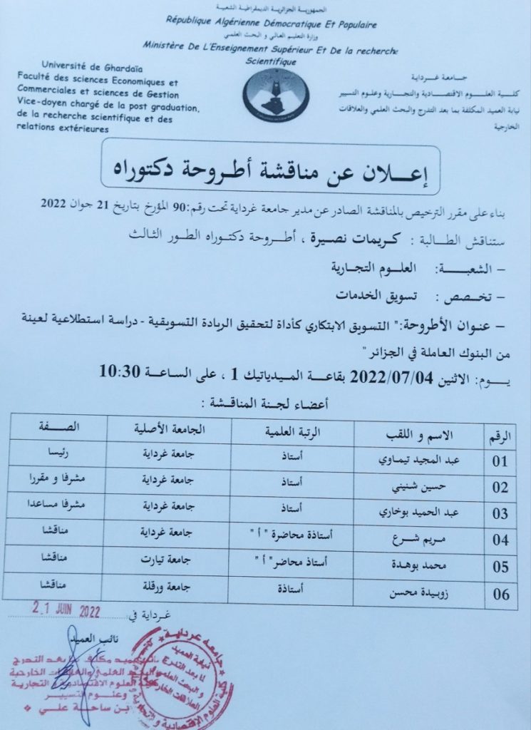 ستناقش الطالبة كريمات نصيرة اطروحة دكتوراه الطور الثالث في شعبة العلوم التجارية تخصص تسويق الخدمات يوم الاثنين 04/07/2022 بقاعة الميدياتيك 1 على الساعة 10.30 صباحا