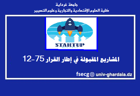 تضع بين أيديكم خلية متابعة التعليم عن بعد بكلية العلوم الإقتصادية والتجارية وعلوم التسيير المشاريع المقبولة في إطار القرار 75-12 من طرف حاضنة الأعمال الجامعية بغرداية